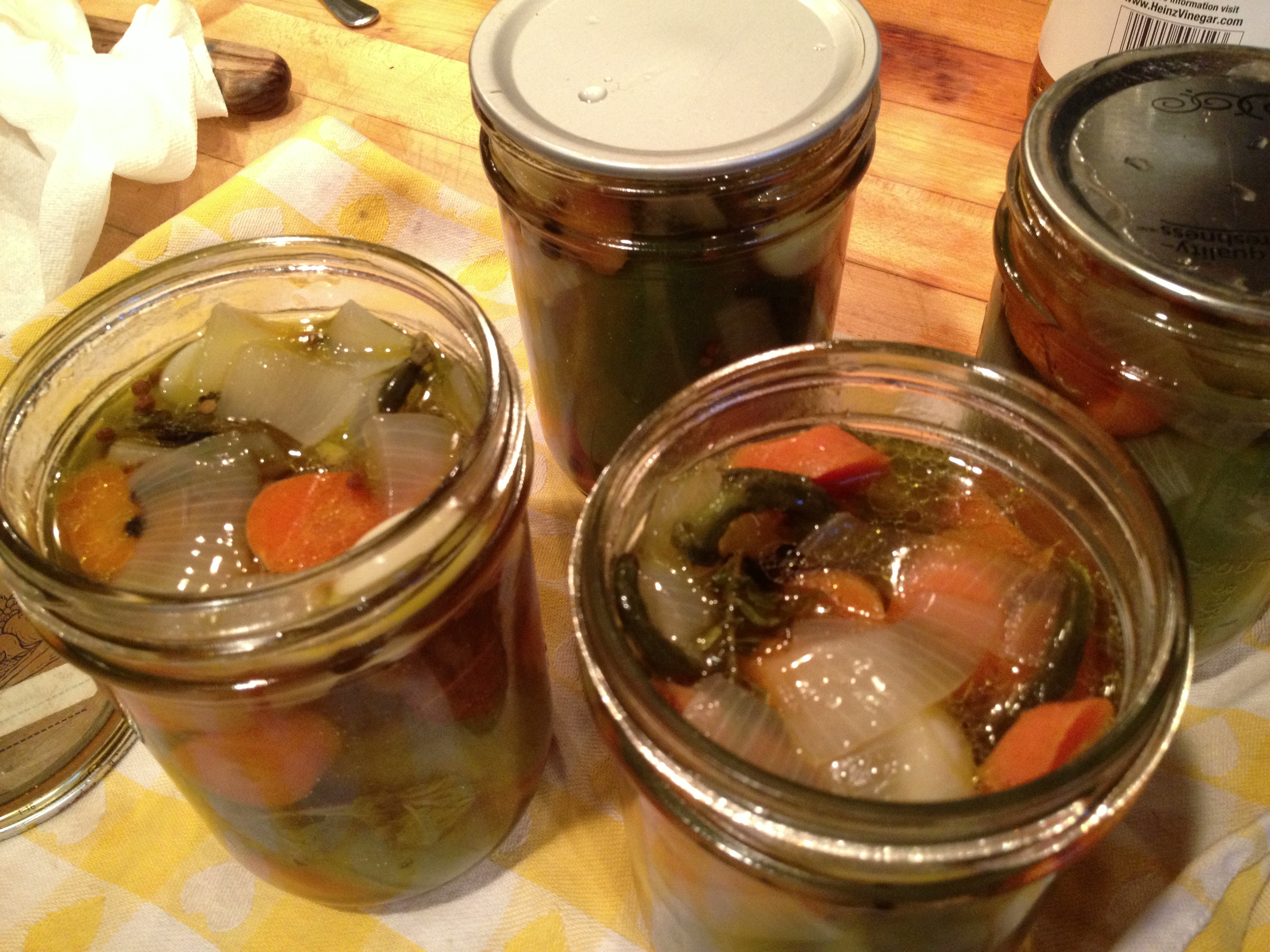 Pack the jalepeños and vegetables into the jars. I usually put 4 large peppers and about a quarter of the vegetables into each jar along with a sprig of the herbs. Cover completely with the brine, leaving ¼ inch headroom. Wipe the rims of the jars, cover and seal with the bands.