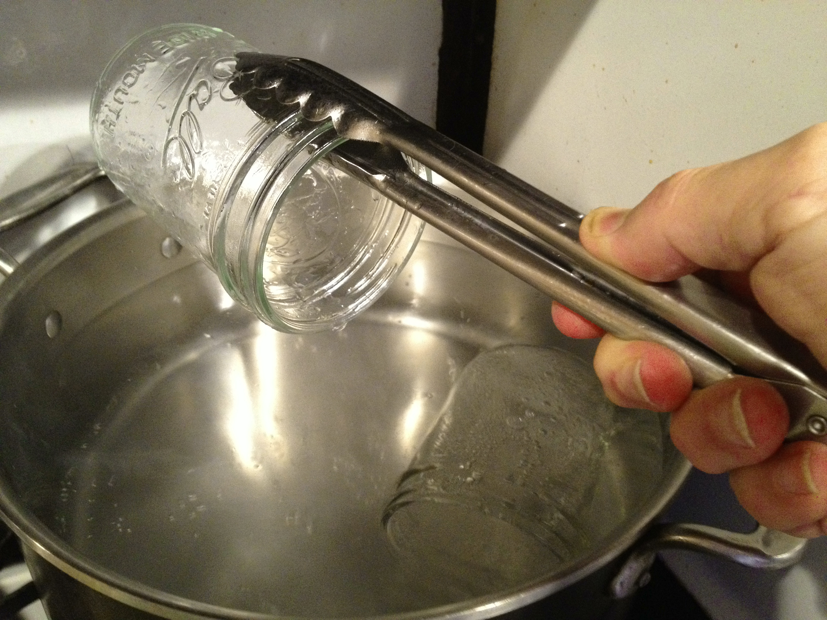Sterilize 4 clean wide-mouth pint mason jars and new lids in boiling water for 5 minutes. Or you can run the jars through the dishwasher and use them right away. Keep the lids in a bowl of hot water until you use them.